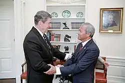 US President Ronald Reagan during a working visit of Prime Minister Prem Tinsulanonda in the Oval Office in 1984