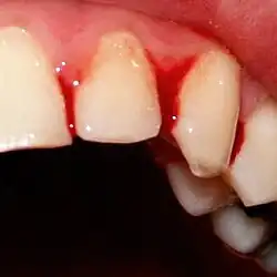 If gingivitis is not treated pregnant individuals can develop periodontitis. Periodontal disease is a chronic condition caused by a bacterial infection to gum tissue and supporting structures. If left untreated it can cause loosening of teeth, bad breath and irreversible bone loss.[13]