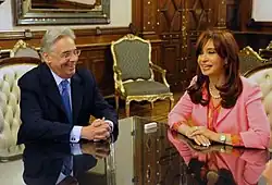 The president elect began a four-year term on 10 December 2007, facing challenges including inflation, union demands for higher salaries, private investment in key areas, lack of institutional credibility (exemplified by the controversy surrounding the National Institute of Statistics and Census of Argentina, INDEC), utility companies demanding authorization to raise their fees, low availability of cheap credit to the private sector, and the upcoming negotiation of the defaulted foreign debt with the Paris Club.[6][7][8] Fernández de Kirchner was the second female president of Argentina, after Isabel Perón, but unlike Perón, Fernández de Kirchner was the head of the ballot, whereas Isabel Perón was elected as vice president of Juan Perón and became president after his death. The transition from Néstor Kirchner to Cristina Fernández de Kirchner was also the first time when a democratic head of state was replaced by his spouse, without involving the death of any of them.[9] Néstor Kirchner stayed active in politics despite not being the president, and worked alongside Cristina Kirchner. The press developed the term "presidential marriage" to make reference to both of them at once.[10] Some political analysts compared this type of government with a diarchy.[9]