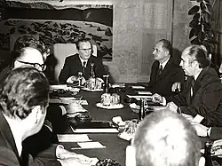 At the LCY Central Committee's 7th Session on 1 July 1968, it accepted the commission's proposal to expand the presidency to about fifty members and establish a smaller, non-political secretariat attached to it at the 9th Congress. This proposal was made because the presidency and the executive committee proved too large, and because of this, informal coordination groups were established to enforce policies. The LCY Central Committee also adopted a proposal to be sent to the 9th Congress for its own self-abolition and replacement with a conference. This, by extension, meant that the office of president of the LCY Central Committee was abolished and replaced with that of president of the LCY.[26] At the same session, the Commission for Cadre Policy of the LCY Central Committee proposed the abolition of the existing proportional representation formula approved by the 5th Session and institute equal representation of all republican branches in the presidency.[27] It also proposed a change to method of elections of presidency members. According to the commission, "it is natural that the deciding role in the nomination of members for the [Presidency] of the LCY belongs to the republican organisations of the League of Communists"; it proposed instituting a system in which candidates for the presidency would be nominated by the republican central committees, elected by the republican congresses and verified by the federal congress. The intention was to turn the individuals in question from presidency members who had come from a republic to "representatives of a republic in the central leadership".[28] The 7th Session approved these changes, and by the 9th Congress on 11–15 March 1969, Tito, in his function as LCY president, was the only remnant of an independent party centre. Until the 9th Congress, important decisions were no longer made at federal meetings but through ad-hoc meetings of republican representatives and interpersonal visits.[28]