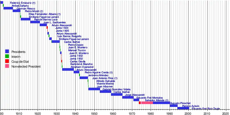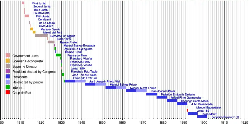 The timeline shows changes, both personal or title, of the head of state and the head of government of the Republic of Chile from 18 September 1810 until today, regardless of whether president, vice-president, supreme director, interim or junta.