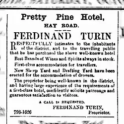 In the Deniliquin Police Court in December 1889 the publican George Rowe was charged "with abandoning his licensed premises at Pretty Pine".[25] In January 1890 it was reported that the Pretty Pine Hotel had been sold by Matthew Hole to Ferdinand Turin.[26]