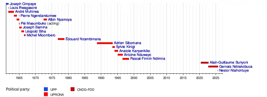 24 June 2020 | 7 September 2022 | 2 years, 75 days | Hutu | CNDD–FDD | Évariste Ndayishimiye![]() (2020–present) | ||