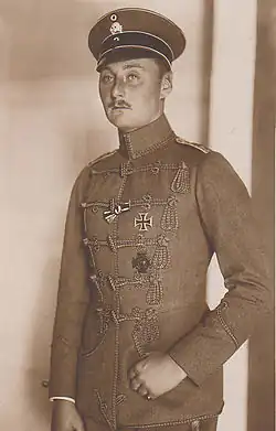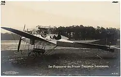 Like some other Hohenzollerns like Prince Heinrich of Prussia, Friedrich was greatly interested in aviation.[1] In 1911, he began building an aeroplane at Glenicke Castle, with the hopes of trying it out the following spring.[1] In 1917, he and his brother Friedrich Karl joined the German flying corps.[2] Later that year, his brother died from war wounds.