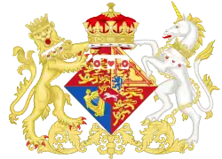As of 1789, as a daughter of the sovereign, Sophia had use of the arms of the kingdom, differenced by a label of three points argent, the centre point bearing a heart gules, the outer points each bearing a rose gules.[57]