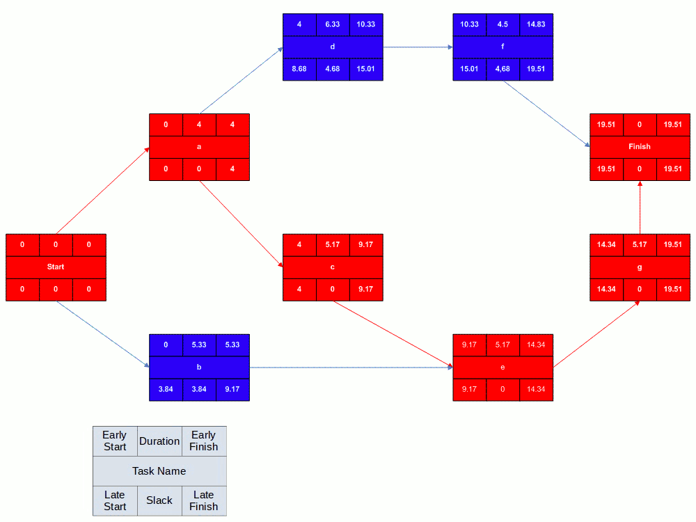 By itself, the network diagram pictured above does not give much more information than a Gantt chart; however, it can be expanded to display more information. The most common information shown is: