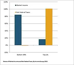 If the federal taxation rate is compared with the wealth distribution rate, the net wealth (not only income but also including real estate, cars, house, stocks, etc.) distribution of the United States does almost coincide with the share of income tax - the top 1% pay 36.9% of federal tax (wealth 32.7%), the top 5% pay 57.1% (wealth 57.2%), top 10% pay 68% (wealth 69.8%), and the bottom 50% pay 3.3% (wealth 2.8%).[8]