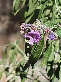 This mintbush is listed as "vulnerable" under the Australian Government Environment Protection and Biodiversity Conservation Act 1999 and the New South Wales Government Biodiversity Conservation Act 2016. In the year 2000, the entire population of the species was estimated to be 110 individuals. The main threats to the species include eutrophication of nearby streams, grazing by goats and the species' small population size.[2][4]