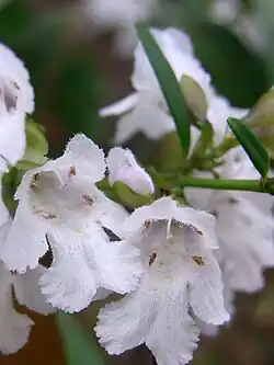 Prostanthera linearis, commonly known as narrow-leaved mint-bush[2] is a species of flowering plant in the family Lamiaceae and is endemic to eastern Australia. It is an erect, faintly aromatic shrub with glabrous, narrow egg-shaped to linear leaves and white flowers that are often tinged with pinkish-mauve.