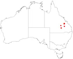 This prostanthera occurs on the central Queensland sandstone belt in the Blackdown Tableland, Expedition and Chesterton Range National Parks where it grows in soil derived from sandstone, on and below sandstone escarpments.[2]