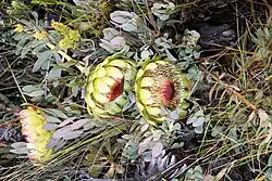 The branches are glabrous.[7] The leaves are glaucous,[5] distinctly veined, mucronate, end acutely and narrow towards the base. They are usually lanceolate in shape, and 1–2 inches (2.5–5.1 cm) in length. The flower heads are sessile on the stems, 2–3 inches (5.1–7.6 cm) long and 3 inches (7.6 cm) in diameter,[7] and have the shape of a bowl.[6] These appear on the plant in the winter months.[5][6] The bracts may be greenish-yellow[5] to deep red.[6]