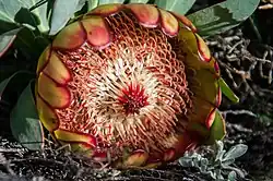 In the wild in South Africa, most populations are of the ground-hugging sort, but populations of taller, erect-growing plants exist at Gydo Pass and across the Gydoberg. These plants are suspected of being natural hybrids with Protea recondita, or perhaps a hybrid of P. recondita crossed with P. pendula, but require further study.[3] Plants on the Matroosberg, the former P. marlothii, have larger, more oblanceolate-shaped leaves than other populations, these grow up to 3 inches (7.6 cm) in length, and in some cases can be twice as broad as those elsewhere. Another difference was said to be slightly larger flower heads, and yellow-brown hairs on the ovary in this form, as well as other tiny details of the inflorescence.[7]