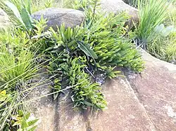 In 1996 it was assessed as "not threatened" in the Red data list of southern African plants, but in 2009 it was re-assessed as "near threatened", due to an estimated population reduction of 20-30%, caused by a loss of 28% of its natural habitat over the past century. It is primarily threatened by the planting of forests of non-native pine trees (afforestation) as well as mining for soapstone.[3] It may, however, be locally common.[5]
