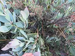 It has large, thick, glaucous and glabrous leaves.[5][6][10][13] These leaves are 3–4.5 inches (7.6–11.4 cm) in length and 1–2 inches (2.5–5.1 cm) broad at the widest parts, although they are only 4.2mm wide at the base (where they connect to the petiole). The shape of the leaves is obovate and cuneate, and the ends of the leaves are rounded (obtuse). The leaves are distinctly veined.[13]