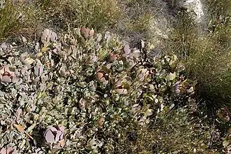 Protea recondita, also known as the hidden sugarbush,[4][5][6] is a flowering plant of the genus Protea within the family Proteaceae,[4][5] which is endemic to the Cape Region of South Africa,[4][3] and distributed from the Piketberg and Cederberg to the Groot Winterhoek mountains.[4][6] The flowers of this unusual plant are pollinated by non-flying mammals: rodents and elephant shrews. In the Afrikaans language it is known as gesigtoehouprotea or skaamroos.[4]