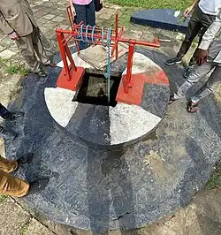 After several unsuccessful attempts at colonization along the Pepper Coast,[3][4][5] the American Colonization Society sent two agents, Robert F. Stockton and Eli Ayers, to negotiate with local chieftains to secure a place for colonization.[2][6] A conference was held at Cape Mesurado, which the locals called Ducor. Reaching an agreement, known as the Ducor Contract, the Society acquired the land bounded on the north and west by the Atlantic Ocean and on the south and east by the Mesurado River, including Cape Mesurado and land on Dozoa Island in the bay.[2][7][Notes 1] To ensure the validity of the purchase,[Notes 2] Ayers and Stockton ensured that all the surrounding chiefs signed the document.[2] It was executed by Gola chiefs Kaanda Njola of Sao's Town and Long Peter of Klay; Dei chief Kai-Peter of Stockton Creek; Kru chief Bah Gwogro (also George) of Old Kru Town; and chief Jimmy from St. Paul River.[11]