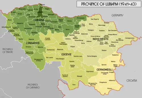 The Province of Ljubljana (Italian: Provincia di Lubiana, Slovene: Ljubljanska pokrajina, German: Provinz Laibach) was the central-southern area of Slovenia. In 1941, it was annexed by the Kingdom of Italy, and after 1943 occupied by Nazi Germany. Created on May 3, 1941, it was abolished on May 9, 1945, when the Slovene Partisans and partisans from other parts of Yugoslavia liberated it from the Nazi Operational Zone of the Adriatic Littoral. Its administrative centre was Ljubljana.