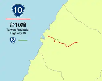Provincial Highway 10 (PH 10, Chinese: 台10線)is a short east–west highway that is entirely within the city limits of Taichung. The highway connects the Port of Taichung with the northern suburbs of Qingshui, Shalu, Daya, Shengang, and Fengyuan. The total length of the highway is 21.13 kilometres (13.13 mi).[1]