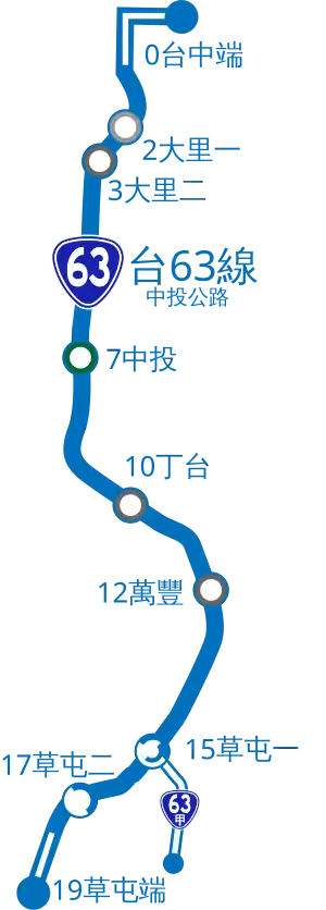 There is a spur (No. 63A) connecting to Bo-ai Road (Provincial Highway No. 14) in downtown Caotun, Nantou. The length of the spur is 2.193 km.