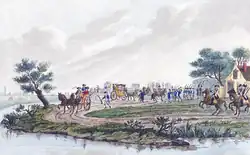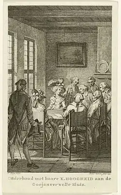 The Princess then returned to Nijmegen, while preparations for the journey to The Hague were made by ordering fresh horses for her carriages along the route in two places. This caused suspicion among the Patriot Free Corps in the area, who in this way were alerted to her supposedly secret travel plans. The military authorities posted Free Corps patrols in the affected area with orders to intercept her. When on 28 June 1787 she departed from Nijmegen to The Hague with a small retinue (a chamberlain, a lady in waiting, and two officers, colonel Rudolph Bentinck, an adjutant of the stadtholder, and Frederick Stamford, the military tutor of her sons), but no armed escort (Harris had advised it was safe enough to only take a bag of gold along to bribe Patriot Free Corps with[11]) she was indeed intercepted near Goejanverwellesluis by a Free Corps patrol from Gouda. She was not mistreated, as has been asserted by Orangist propagandists, but only temporarily detained in a nearby farm, to await the arrival of members of the Military Commission in Woerden. The only untoward thing that happened was that the leader of the patrol drew his saber, but he put it back in its scabbard when requested. When the Military Commission arrived she was told she would not be allowed to proceed to The Hague, for fear of instigating public unrest there, but she was immediately released, and allowed to return to Nijmegen.[12]
