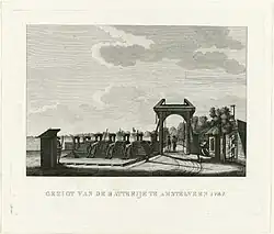 One of the consequences of the reconstitution of the States of Holland in The Hague was that this body could order the States-Army garrisons of a number of the fortress towns behind the Hollandse Waterlinie to offer no resistance to the advancing Prussians. Naarden, under the command of the Patriot leader Adam Gerard Mappa, surrendered for that reason on 27 September, as did nearby Weesp. This enabled Lottum, who had up to that moment made little progress, to approach Amsterdam closely from the East.[41] The main Prussian force of Gaudi and Knobelsdorff under personal command of the Duke had reached Leimuiden on the 23rd. The next day he had Amstelveen reconnoitered, where there was a strong defensive line of the Patriot forces in Amsterdam. The entire region had been inundated, so that the city could only be approached along a number of narrow dikes and dams that could easily be defended. The defensive line formed a crescent from Halfweg, West of Amsterdam, via Amstelveen to the South, to Muiden, East of Amsterdam. But the commanders of the troops in Amsterdam realized that they could not expect to survive a Prussian assault. They desperately tried to temporize by asking for a ceasefire and negotiations. An Amsterdam delegation consisting of Abbema, Gales, Goll and Luden arrived in Leimuiden on 26 September to offer terms, but the Duke replied to their request with the remark that they could best adhere to the resolution that the rump-States of Holland were about to adopt in which they meekly asked the Princess what she required to satisfy her honor. The deputation returned to the Amsterdam vroedschap with this answer and a new deputation was sent to The Hague on the 29th to do this. The Duke visited the Princess incognito on the 28th to urge her to accept the overtures of the Amsterdam delegation, because he had little desire to attack Amsterdam, whose defenses he considered too formidable.[42]