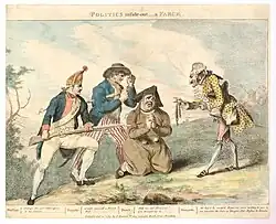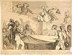 However, this was a political impossibility for the States of Holland: for the democrats the admission of the Princess to The Hague had acquired great symbolic significance. If the "triumvirate" of "aristocratic" Patriot pensionaries (Zeebergh, de Gijselaar, and van Berckel) and the Grand Pensionary Pieter van Bleiswijk would accede to the Prussian demand, that would cause a popular insurrection against them.[27] The lack of a positive reaction of the Holland government caused a shift in the stance of the Prussian government, promoted by Hertzberg, who was assisted by a "leak" of the British government to the Prussians of its correspondence with the French government about its demand to be allowed to join the mediation. This made clear that the French already had acceded to this demand, without informing the Prussians. It also became clear that the British were far more enthusiastic about putting pressure on the Patriots than the French. Harris always had sonorously given as his motive his respect for "the Ancient Dutch Constitution" (by which he meant the arrangement that had been instituted in 1747 and was therefore at the time only forty years old) that had to be Restored (also because it implicitly guaranteed British "rights" to a preponderant position in the Low Countries in the name of maintaining the Balance of Power on the Continent). This fully complied with the Orangist position in the conflict with the Patriots. In other words, the British standpoint was incompatible with the French one as a basis for a compromise to be imposed in the mediation. But it was attractive to Prussia, because the British fully supported the king's demand for "satisfaction", and they encouraged him to take military steps.[28]