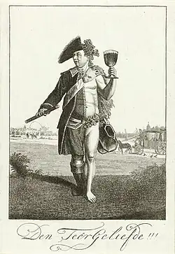 Spotprent op Willem v, half militair, half Bacchus Spotprent op Willem V, half militair, half Bacchus, 1786 Den Teêr Geliefde