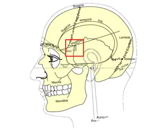 The pterion is known as the weakest part of the skull.[3] The anterior division of the middle meningeal artery runs underneath the pterion.[4] Consequently, a traumatic blow to the pterion may rupture the middle meningeal artery causing an epidural haematoma. The pterion may also be fractured indirectly by blows to the top or back of the head that place sufficient force on the skull to fracture the pterion.