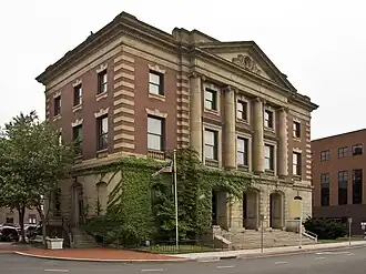 Public Safety Building, or Old Post Office, is a historic building in Cumberland, Allegany County, Maryland. It was constructed between 1902 and 1904, in the Classical Revival style. It is built of brick, rising from a monumental stone base. There is a slightly projecting pavilion with four engaged Ionic columns on the second and third floors. The building was built originally as the United States Courthouse and Post Office during the tenure of James Knox Taylor (1857-1929), who was Supervising Architect for the U.S. Treasury.[2] It served as a courthouse of the United States District Court for the District of Maryland from 1904 to 1933.[3] It is considered to be typical of buildings constructed during Taylor's tenure to the specifications of the Tarsney Act, which required competition in the design of federal buildings.[4]