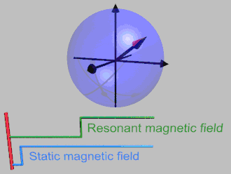 The basic principle of pulsed EPR and NMR is similar. Differences can be found in the relative size of the magnetic interactions and in the relaxation rates which are orders of magnitudes larger (faster) in EPR than NMR. A full description of the theory is given within the quantum mechanical formalism, but since the magnetization is being measured as a bulk property, a more intuitive picture can be obtained with a classical description. For a better understanding of the concept of pulsed EPR consider the effects on the magnetization vector in the laboratory frame as well as in the rotating frame. As the animation below shows, in the laboratory frame the static magnetic field B0 is assumed to be parallel to the z-axis and the microwave field B1 parallel to the x-axis. When an electron spin is placed in magnetic field it experiences a torque which causes its magnetic moment to precess around the magnetic field. The precession frequency is known as the Larmor frequency ωL.[5]
