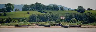 In 1909, following a collapse in the bank of the river,[12] the canal company's chief engineer Mr A. J. Cullis called for old vessels to be run aground along the bank of the Severn, near Purton, to create a makeshift tidal erosion barrier to reinforce the narrow strip of land between the river and canal.[13] Barges, trows and schooners were "hulked" at high tide, by towing them from the dock at Sharpness and releasing them to be carried up the bank on the tide. Holes were then made in their hulls so that they filled with water, and over time silt has been laid down inside them.[13]
