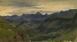 The painter Théodore Rousseau traveled to Cantal in 1830 and produced numerous studies, including that of the Saint-Vincent-de-Salers valley. The valley is crossed by the Mars River and is home to many villages. Puy Mary is at the center, with the small peak of Puy de Peyre-Arse to its left, and below the sharp peak to the right is the Col du Redondet.[4]