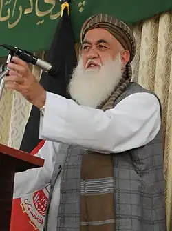 An ethnic Mohmand Pashtun from Nangrahar Province, Qazi Amin attended a madrasah in Pakistan, before graduating at the Islamic Law Faculty of Kabul University. While at university, he became an active member of the Islamist Muslim Youth movement.[2] In 1975, following the repression of the Islamist movement by Daoud Khan, Qazi Amin escaped to Peshawar.[3] During the late 1970s and early 1980s he served several times as leader of Hezbi Islami Gulbuddin, though he was more often deputy leader to Gulbuddin Hekmatyar. In 1985, he quit HIG and founded his own party, which had only a limited influence. After the fall of the Democratic Republic of Afghanistan in 1992, he held an appointment as Minister of Communications from 1994 to 1997.[2][4]