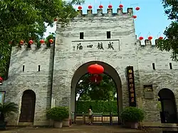 Qianshan's Meixi Village is the home to the Meixi Royal Stone Archways. The three engraved granite archways were built by order of the Guangxu Emperor in 1886 and 1891 in honor of Chen Fang (t , s , Chén Fāng) or Chun Afong, a native of Meixi who served as China's first consul to Hawaii and became a prominent philanthropist. It is surrounded by a 126,000 m2 (31-acre) park[19] covering the old Chen estate, expanded by Chen's son Tony (t , s , Chén Xírú),[20] and its gardens.[21] The site also houses the Waxworks Hall of Historical Figures of Zhuhai and a folk art exhibition.[22][21]