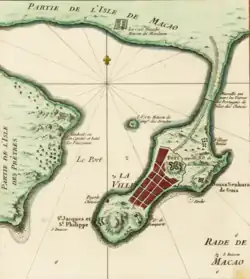 Qianshan became the seat of the subprefect or "keun-min-foo" (t 軍民府, s 军民府, jūnmínfǔ)[12] in 1731.[13] He was charged with dealing with the foreign settlement and overseeing their trade with Guangzhou ("Canton").[2] As part of these duties, he controlled the permits needed for pilots (引水人, yǐnshuǐrén) of the ships sailing north through the Humen ("Bocca Tigris" or "Bogue")[1] to the Huangpu Anchorage ("Whampoa", now Pazhou).[13] He would ensure that foreign ships headed upriver had some cargo apart from silver dollars and bullion.[13] He was also sometimes obliged to quarantine Macao's market, prohibiting Chinese farmers and merchants from trading there and supplying its food, in order to maintain the freedom of the area's Chinese to practice Buddhist and local rituals, which the Portuguese periodically attempted to prohibit.[14] In the lead-up to the First Opium War, Lin Zexu and Deng Tingzhen visited Qianshan during their procession from Xiangshan (now Zhongshan) to visit the Portuguese authorities at Macao on 3 September 1839.[15]