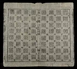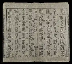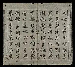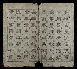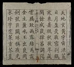 The Thousand Character Classic is understood to be one of the most widely read texts in China in the first millennium.[3] The popularity of the book in the Tang dynasty is shown by the fact that there were some 32 copies found in the Dunhuang archaeological excavations. By the Song dynasty, since all literate people could be assumed to have memorized the text, the order of its characters was used to put documents in sequence in the same way that alphabetical order is used in alphabetic languages.[4]