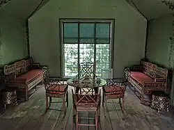 Queen Charlotte's Cottage dates from 1772, and is one of the earliest examples of a cottage orné.[4] The design is timber-framed with brick infill, which has been attributed to the North German vernacular which the Queen will have recalled from her childhood.[5] The roof is thatched, and the simple doors are made of rough planks with wooden latches.[6] The windows, which are large for a cottage, are recycled 17th-century frames with leaded panes.[7] Inside, the cottage is more elaborate than is usual for a cottage orné.[8] There are two main rooms: the Print Room downstairs and the Picnic Room above it, linked by a cantilevered staircase.[9] The Picnic Room was painted by Princess Elizabeth (who had been taught botanical drawing by Franz Bauer)[10] in the early 19th-century to represent the interior of a bower.[11]