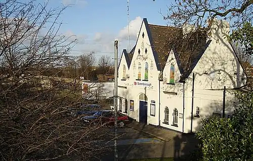 Until the opening of Swale Halt in 1922, Queenborough was the only intermediate station on the Sheerness Line.[14][15] The imposing two-storey station building has a strong Victorian character with its high-pitched gables and round-headed sash windows.[14] The building is in a similar style to Lymington Town railway station which dates from the same period, a resemblance which may be explained by the fact that the construction of both the Lymington branch line and the S&SR was overseen by John Cass Birkinshaw who was replaced as engineer on the S&SR after the company's directors blamed him for the line's slow construction.[16]