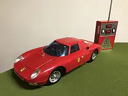 - 1966 ElGi Ferrari 250LM - Another commercially viable RC car was available by mid-1966, produced by the Italian company El-Gi (Elettronica Giocattoli) from Reggio Emilia. Their first model, an electric 1:12 Ferrari 250 LM had a radio-controlled on-off motor function with no reverse. Steering had two on-off switches, turn radius was determined by how long the operator held down the appropriate left or right switch on the transmitter. An extensive article about the car and its driving characteristics appeared in the June 1966 Italian magazine Quattroruote.[22][23]