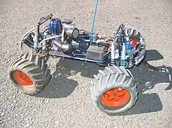 Steering was rack and pinion with an independent front suspension. The overall length of this pioneering vehicle was 16+12-inch, with a height of 4+12-inch, a width of 6+14-inch and an all-up weight of 3 ½ pounds.[10][11]