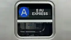 On the exterior, the cars have a blue front with large windows, LED headlights, and a blue stripe with gold accents on the sides. To designate the route, a large LED screen with the route bullet is displayed at the ends of the train, while the route's destination is displayed above the door on the front. On the sides, there is a screen that displays both the route bullet and the route's destination.[28] These exterior displays are very similar to the rollsigns on older trains (R40 to R68A), while the front destination display is similar to the overhead rollsign arrangement last used on the R38 cars from 1966, which displayed both the route and destination.