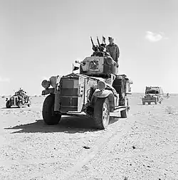 ![]() Fordson Armoured Cars and support vehicles of No. 2 Armoured Car Company RAF, leave their base for a patrol in the Western Desert, 1941. | |