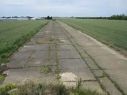 Today, the B-road which connects the village of Stow Longa to the town of Kimbolton crosses over the remains of RAF Kimbolton's main runway with its crumbling concrete visible just past the shoulder of the road. Additionally, a public footpath crosses the main area where one of the two control towers once stood, the foundations of which are still recognisable among the farmland.[5]