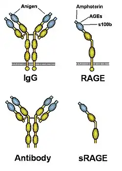 - ^ a b c Ramasamy R, Shekhtman A, Schmidt AM (2016-04-02). "The multiple faces of RAGE--opportunities for therapeutic intervention in aging and chronic disease". Expert Opinion on Therapeutic Targets. 20 (4): 431–446. doi:10.1517/14728222.2016.1111873. PMC 4941230. PMID 26558318.