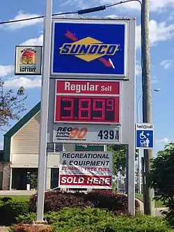 Brighton, MI Sunoco Price sign advertising availability of Rec-90 Gasoline.