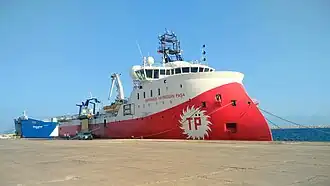 The ship was acquired in December 2012[6] by the Turkish state-owned oil and gas company TPAO to an amount of US$130 million for use in marine seismographic surveys, Minister of Energy and Natural Resources Taner Yıldız said on 30 January 2013. The sale includes a collaboration arrangement with Polarcus company for support service in seismic data acquisition, fast-track data processing, management and crewing for the vessel over a three-year period.[7] After repainted in red and white at Desan Shipyard in Tuzla, Istanbul, reflagged and renamed to Barbaros Hayreddin Paşa, she was commissioned on 23 February 2013 by Prime Minister Recep Tayyip Erdoğan. In the beginning, she will operate in a region around 60–70 km (37–43 mi) far from Bosporus in western Black Sea. Later, she will continue with surveys in the Mediterranean Sea for oil and gas field exploration.[8][9][10][11]