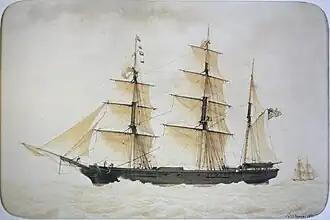 1. ^ Clark, Arthur (1911). The Clipper Ship Era; An Epitome of Famous American and British Clipper Ships, Their Owners, Builders, Commanders, and Crews, 1843-1869. New York & London: G. P. Putnam's Sons. p. 179.