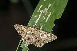 This species has a wingspan of 45 to 54 mm.[4] Forewings with veins 10 and 11 stalked. Body brownish ochreous, thickly irrorated (speckled) with rufous brown. Forewings with antemedial, medial, and postmedial specks series, where the latter with a brownish patch at the middle. There is an indistinct pale waved submarginal line present. Hindwings with indistinct antemedial line. Crenulate postmedial line with brown patch at middle, and indistinct waved submarginal line. Both wings with marginal series of specks present. Ventral side is pale ochreous with prominent cell-spots. Outer area fuscous with the margin paler.[5]