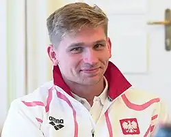 Radosław Kawęcki (born 16 August 1991) is a Polish competitive swimmer who specializes in backstroke events. Kawęcki won the silver medal in the 200 m backstroke at the 2013 and 2015 World Aquatics Championships, and was twice the 200 m backstroke short course world champion. He won four gold medals at the FINA World Swimming Championships in the 200 m backstroke. He is an 8-time European champion in the backstroke events. Kawęcki finished fourth at the 2012 Summer Olympics in London in the 200-meter backstroke.[2] He currently represents the Cali Condors which is part of the International Swimming League.