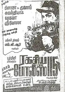 Ragasiya Police 115 (transl. Secret Agent 115) is a 1968 Tamil-language spy film, directed by B. R. Panthulu. The film stars M. G. Ramachandran, J. Jayalalithaa, Venniradai Nirmala supported by M. N. Nambiar, S. A. Ashokan and Nagesh. It was released on 11 January 1968,[1] and ran for 100 days in theatres, becoming a hit at the box office.[2][3]